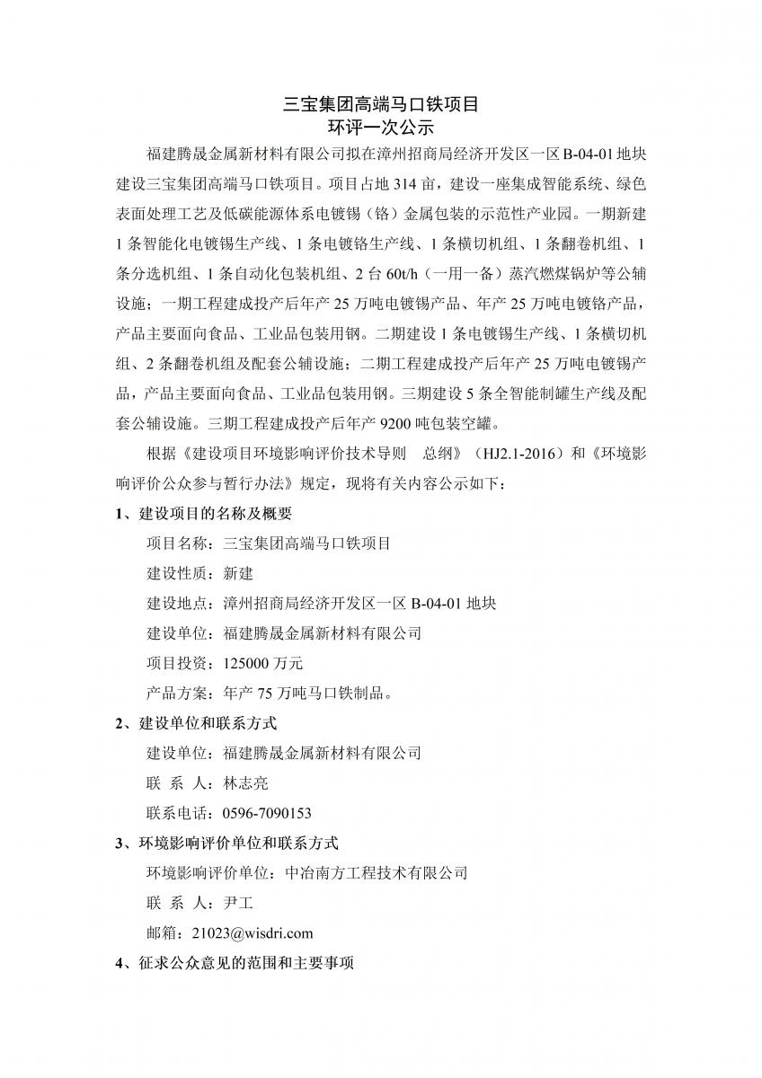 三宝集团高端马口铁项目 环评一次公示